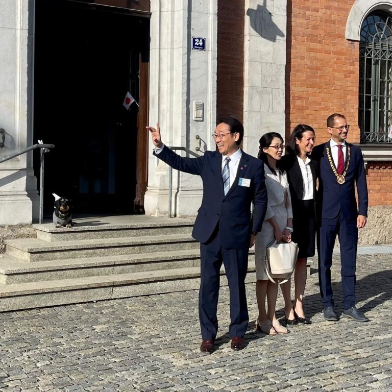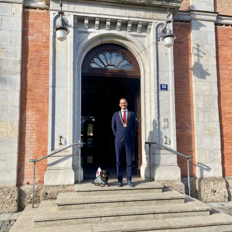 Am vergangenen Donnerstag durfte er als Botschafter der bayerischen Lebensart bei der Begrüßung der japanischen Delegation der Städtepartnerschaft der Stadt Rosenheim mit dem japanischen Ichikawa zusammen mit dem Oberbürgermeister Andreas März die Gäste begrüßen. Zünftig ausgestattet mit Trachtenjanker und japanischer Flagge blieb er geduldig und souverän auf den Eingangstufen zum Rathaus an der Königstrasse an der Seite seiner "menschlichen Kollegen" und gab so ein bezauberndes Fotomotiv für die begeisterten Gäste ab.